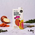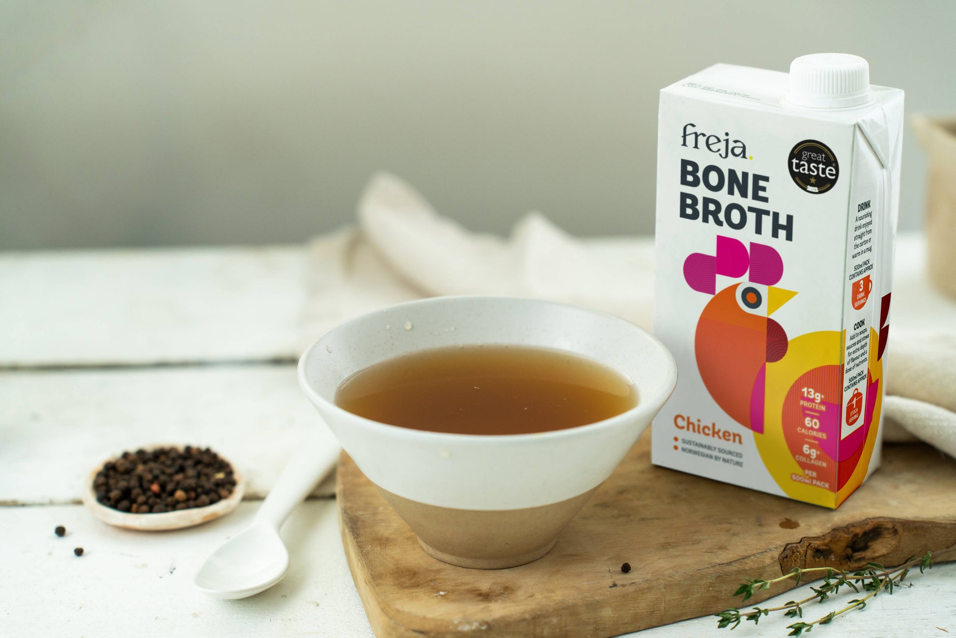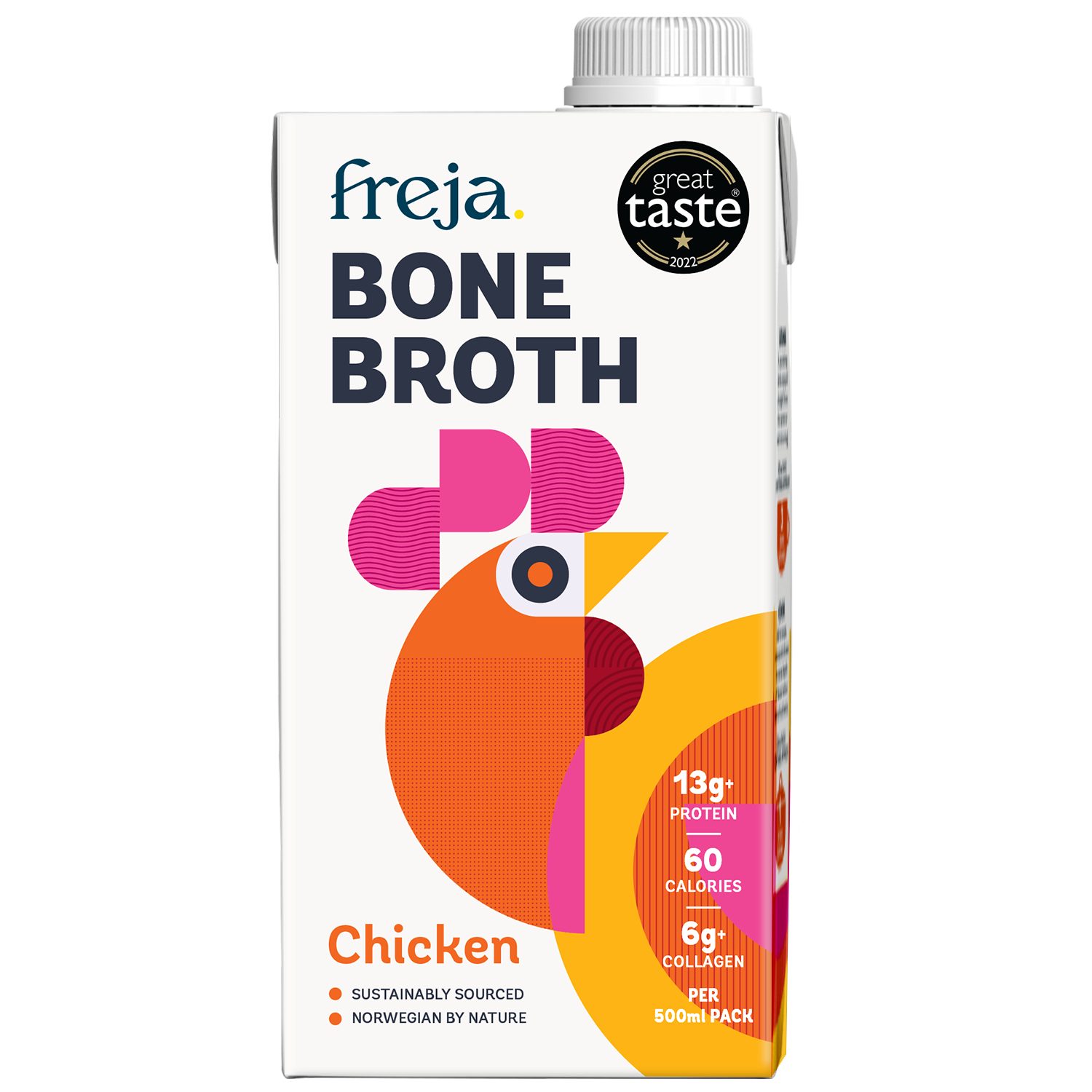 Freja’s Classic Chicken Bone Broth is a savoury, slow-cooked broth made from responsibly sourced Norwegian free-range chicken bones. Crafted to maximise nutritional value and taste, it’s rich in natural collagen and protein, making it ideal for sipping or enhancing savoury recipes.