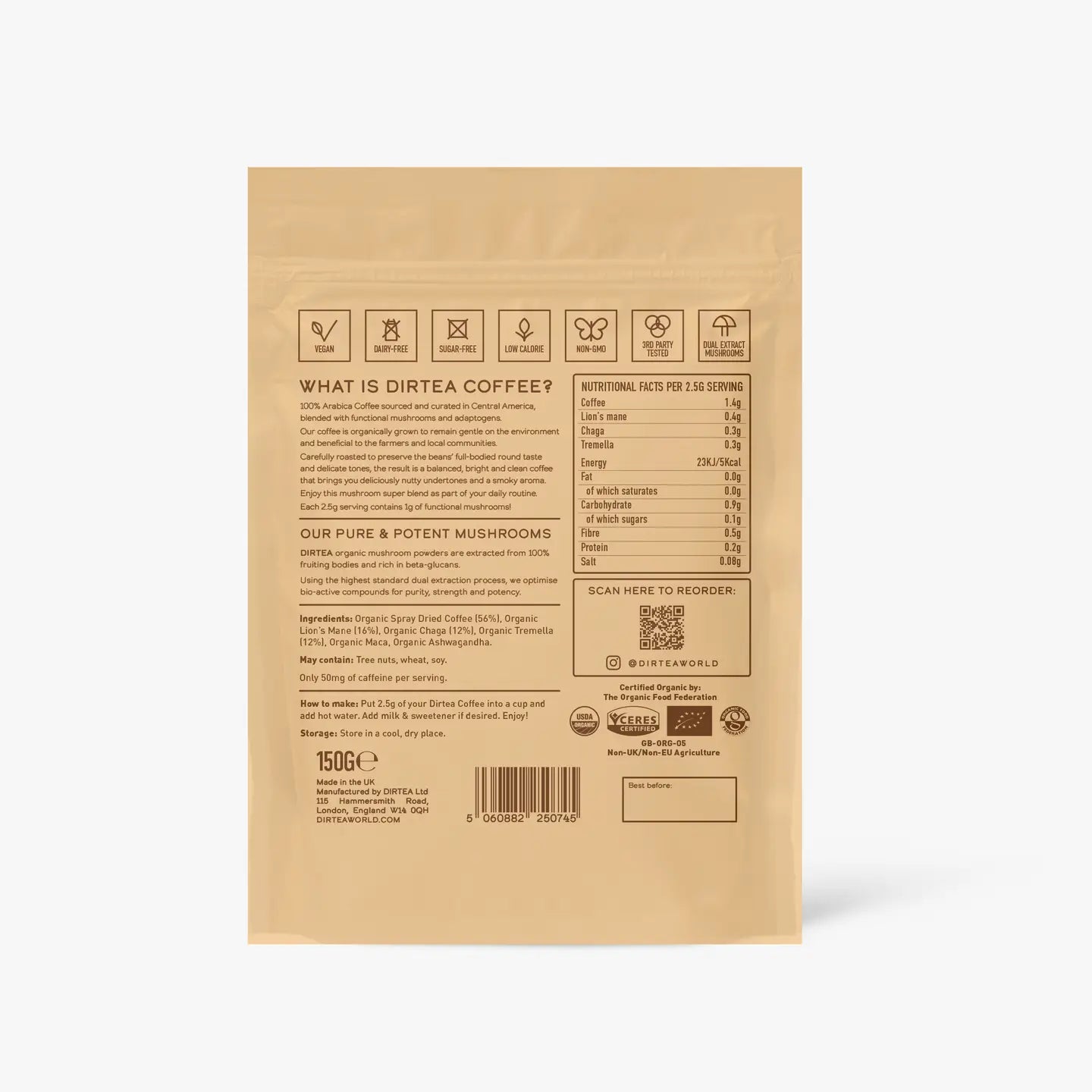 Enjoy the rich, nutty flavour of premium 100% Arabica coffee—now enhanced with the power of functional mushrooms and adaptogens. Infused with Lion’s Mane for focus, Chaga for energy, and Tremella for hydration, DIRTEA Mushroom Coffee gives you all the benefits of coffee with up to 80% less caffeine, minus the crashes or jitters.