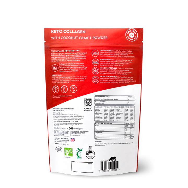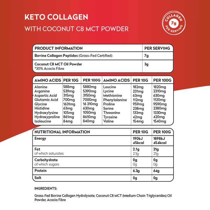 In every serving, you’ll get 7g of premium collagen to replenish amino acids that modern diets often lack, plus 3g of C8 MCT oil the most ketogenic MCT, known for its rapid conversion into ketones for clean, sustained energy. Whether you’re powering your morning coffee, recovering after exercise, or enriching your recipes, Keto Collagen fits seamlessly into your healthy lifestyle.