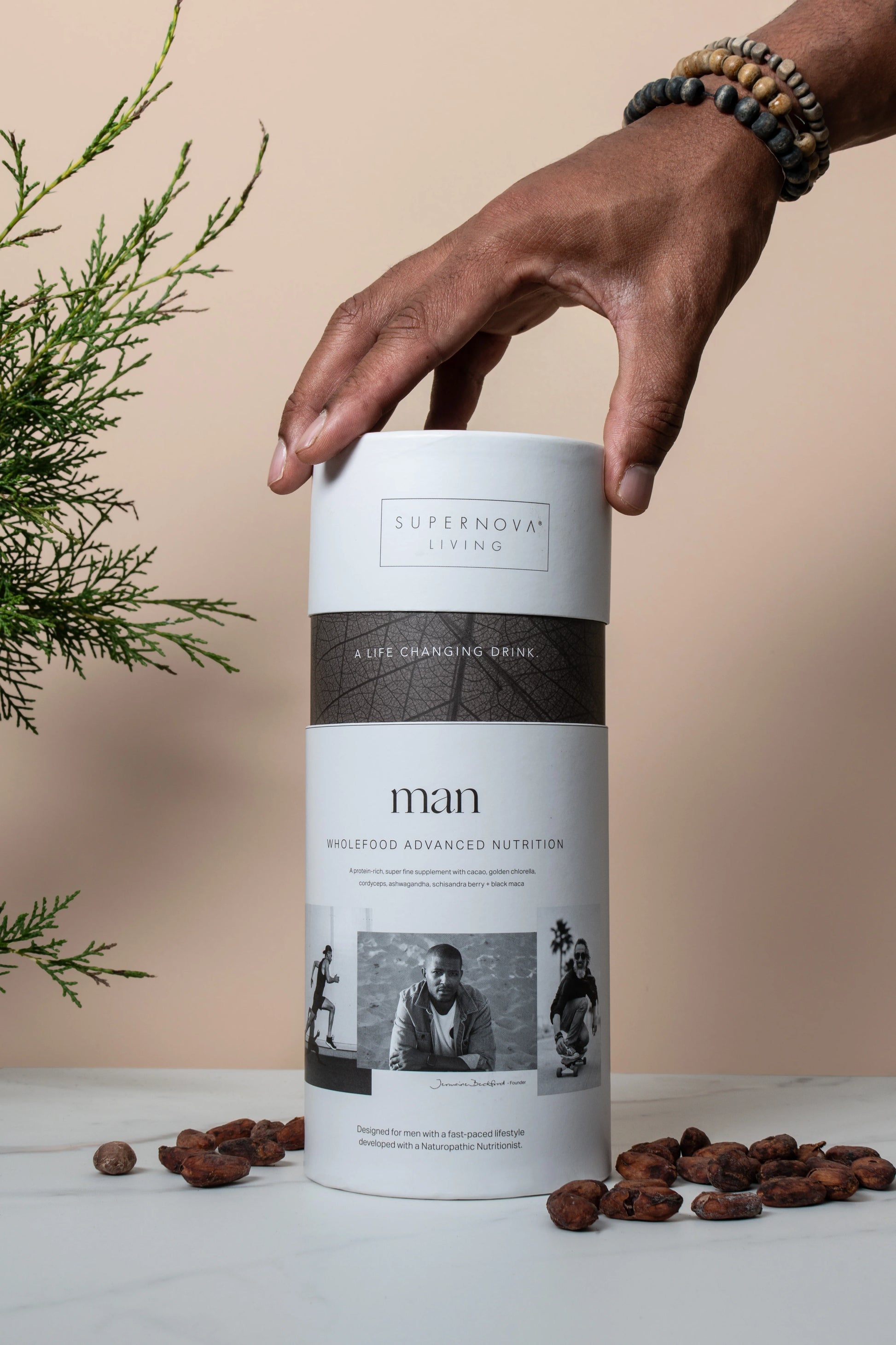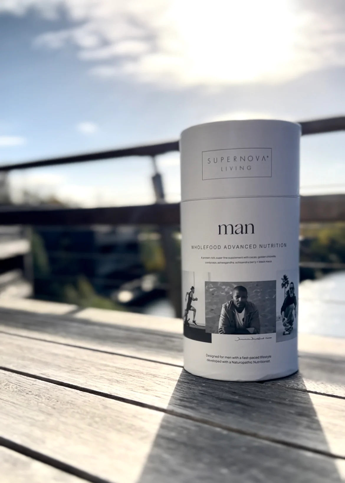 Supernova Living MAN is a high-performance, plant-based nutritional blend formulated to fuel male energy, vitality, and focus. More than a protein powder, MAN02 combines complete plant protein with stress-balancing adaptogens, detoxifying superfoods, and cognition-enhancing mushrooms all crafted to promote endurance, muscle recovery, and overall well-being.